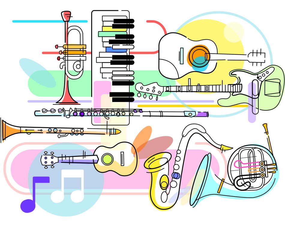 flûte, clarinette, saxophone, trompette, violon, trombone, tuba, percussions/batterie, chant, piano classique, piano jazz, guitare basse électrique, MAO (musique assistée par ordinateur).